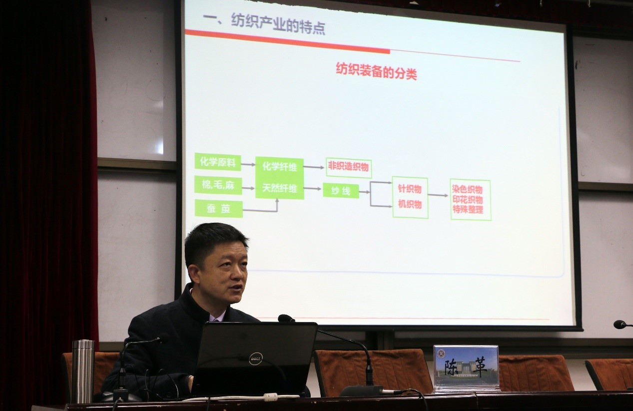 陈革教授首先指出智能制造正助推我国纺织产业的转型升级,从中低端向高端发展。报告分别从纺织产业的特点;纺织制造自动化、数字化、信息化的内涵;纺织机器人的定义、分类和技术特点与我国纺织机器人技术的应用现状和需求分析;我国纺织产业智能制造的现状和技术水平;纺织智能制造标准及共性技术、生产类型以及纺织智能制造新模式等几个方面进行详细讲解,重点分析了我国纺织产业智能制造的发展规划和路径。陈革教授的报告风趣幽默,旁证作用,深入浅出,赢得了师生的热烈掌声。会后陈革教授与师生进行了深入交流探讨,鼓励师生要积极创新,重视学科交叉融合,力争称为全方位发展人次。
