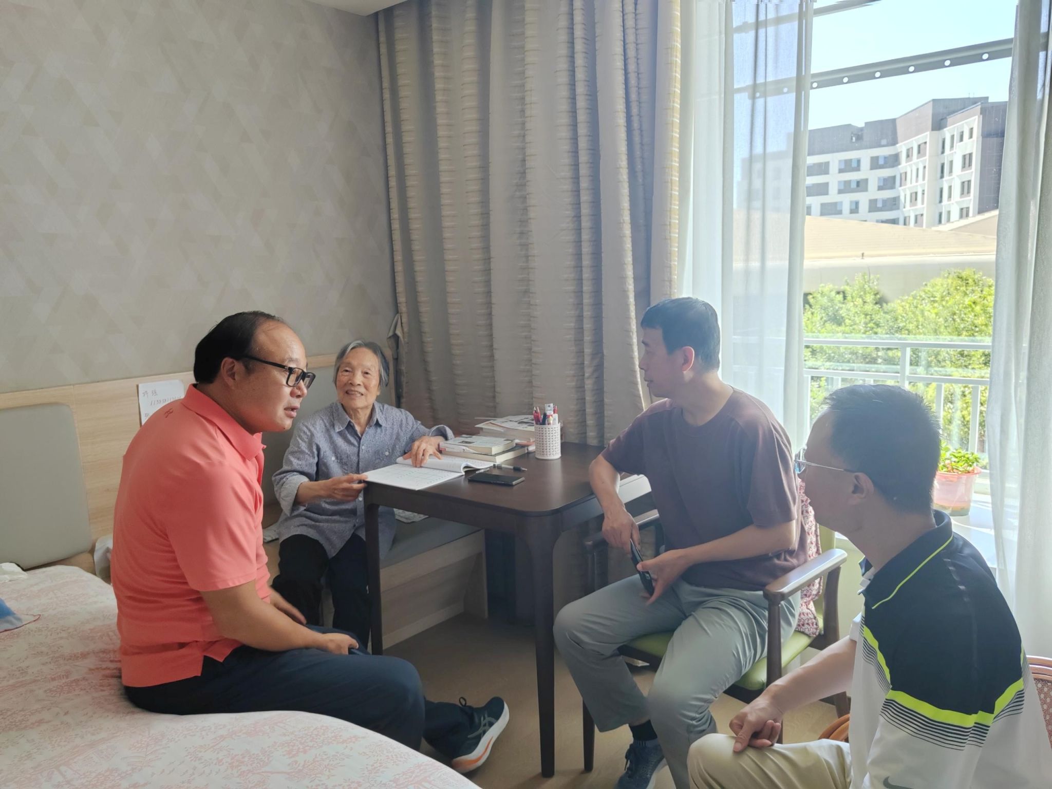 8月16日上午,校友们一同来到位于中牟县的“泰康之家豫园”,怀着深深敬意探望在此疗养的张明玉老师。虽已整整九十高龄,张老师依然保持着学者风范——思路清晰、心态阳光,她甚至能准确指出三十多年前同学们上课的教室方位。她谈起往事时眼带笑意,那种"三尺讲台育桃李"的教师本色从未褪色。看到张老师在这样集医疗护理、文化康养于一体的机构养老,同学们颇感欣慰。临别时,张老师执意送校友到康养中心大门外,久久不愿离去。