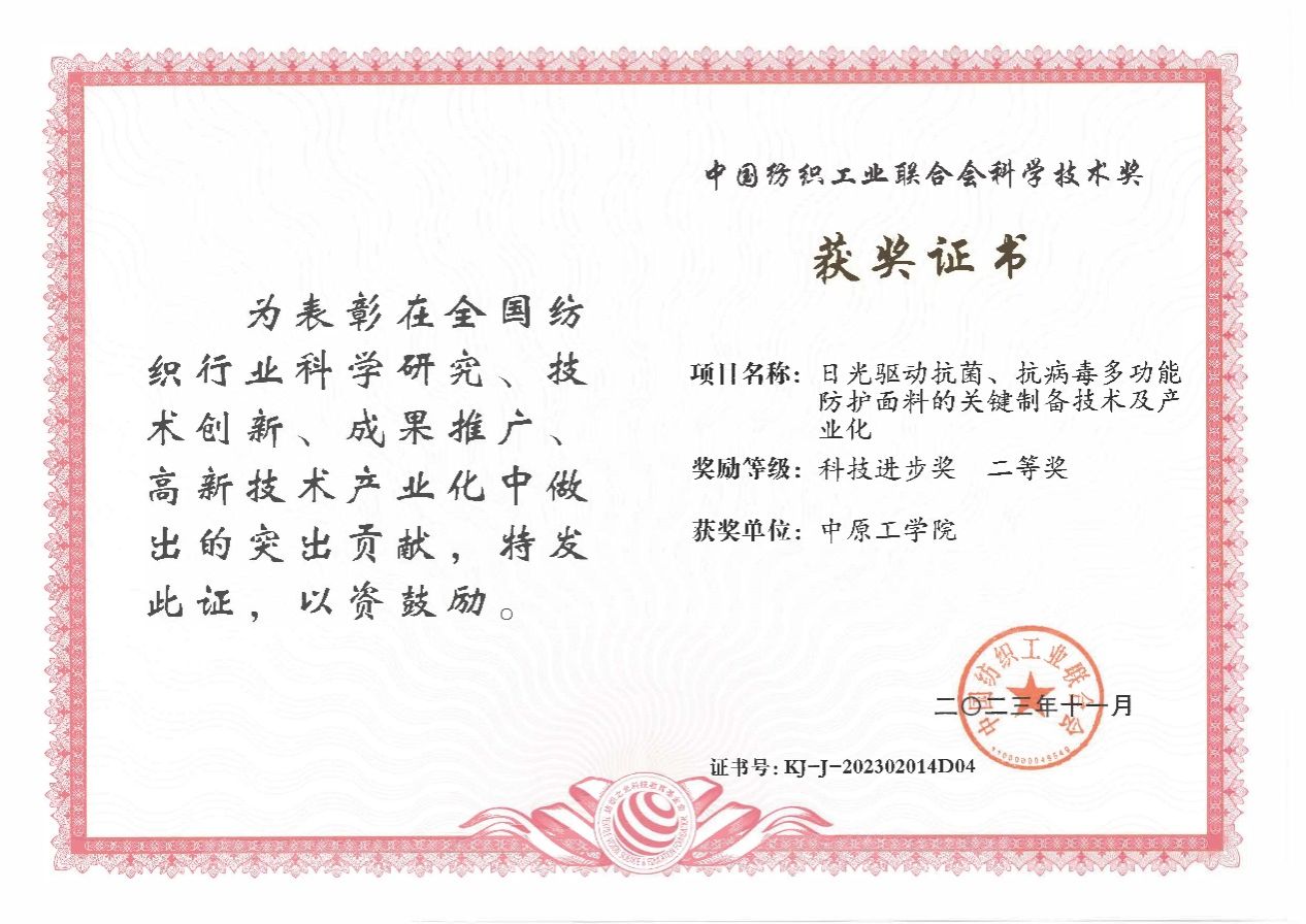 我院张恒老师的项目“日光驱动抗菌、抗病毒多功能防护面料的关键制备技术及产业化”荣获2023年度中国纺织工业联合会科学技术进步奖二等奖。