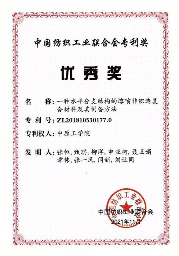 我院张恒老师主持的项目“一种水平分支结构的熔喷非织造复合材料及其制备方法”荣获中国纺织工业联合会专利奖优秀奖