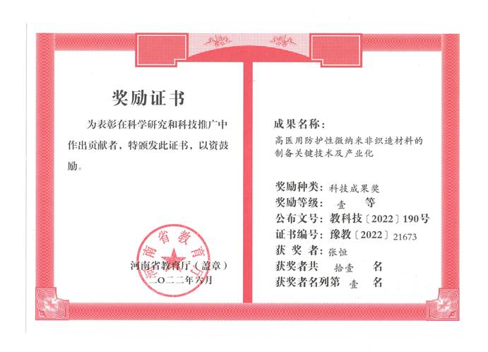我院张恒老师主持的项目“高医用防护性微纳米非织造材料的制备关键技术及产业化” 荣获2022年河南省教育厅科技成果奖一等奖。