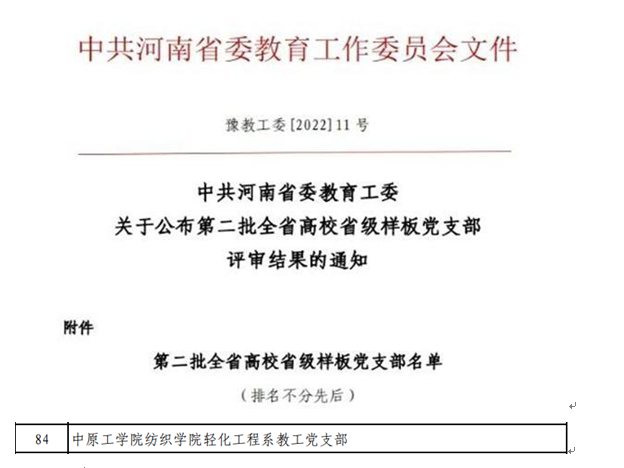 近日,河南省委、教育工委公布了“第二批全省高校省级样板党支部”评审结果,我院轻化工程系教工党支部获批第二批全省高校省级样板党支部,这是我院推进党建“双创”工作与强基引领行动计划建设取得的标志性成果,充分展现了我院基层党组织标准化规范化建设取得的扎实成效。