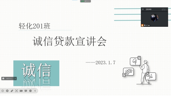 宣讲会的方式主要以班级线上讲解为主,整体的主题围绕诚信贷款、诚信还款、贷款政策详情等一些内容进行宣讲,积极践行社会主义核心价值观,提高同学们的综合素质及诚信修养,确保落实到每一位学生知其政策,了其所然。