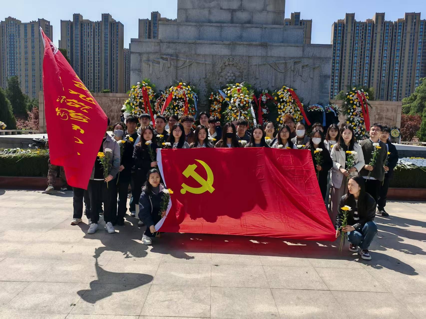 当日上午,师生们怀着崇敬的心情,整齐列队步入郑州市烈士陵园,伴随着雄壮的中华人民共和国国歌响起,全体师生肃立默哀,向革命烈士们敬献花,他们以无声却有力的动作,表达着对革命烈士们深切的缅怀。同时,学生代表向烈士纪念碑敬献花篮,整理花篮缎带,寄托对先烈的缅怀。