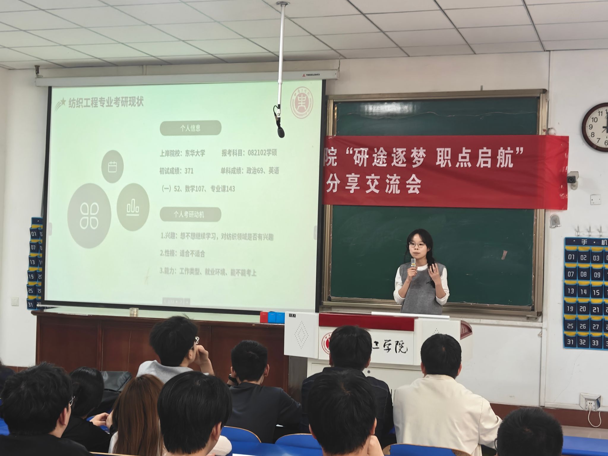 考取哈尔滨工业大学、天津工业大学、东华大学、江南大学、浙江理工大学的纺织213班段蕾蕾、非织造211班赵伊宁、轻化212班张舒淇、轻化212万科研、纺织211班梁亚格等5位同学依次围绕合理定位目标院校、科学制定复习计划、专业备考和心态调整等关键问题向同学们提出了宝贵的建议,同时提醒同学们应结合自身实际综合考量考试科目、知识要点、时间分配等因素,做到有的放矢,精准备考。成功入职江苏苏美达集团公司、波司登国际控股有限公司的纺织21级卓越班常玉莹、袁媛,她们从就业信息收集、面试技巧到简历优化等方面分享了求职的经验。低年级同学提前准备好“问题清单”,与分享嘉宾进行互动,交流会现场气氛热烈,整场交流会持续近2个半小时。