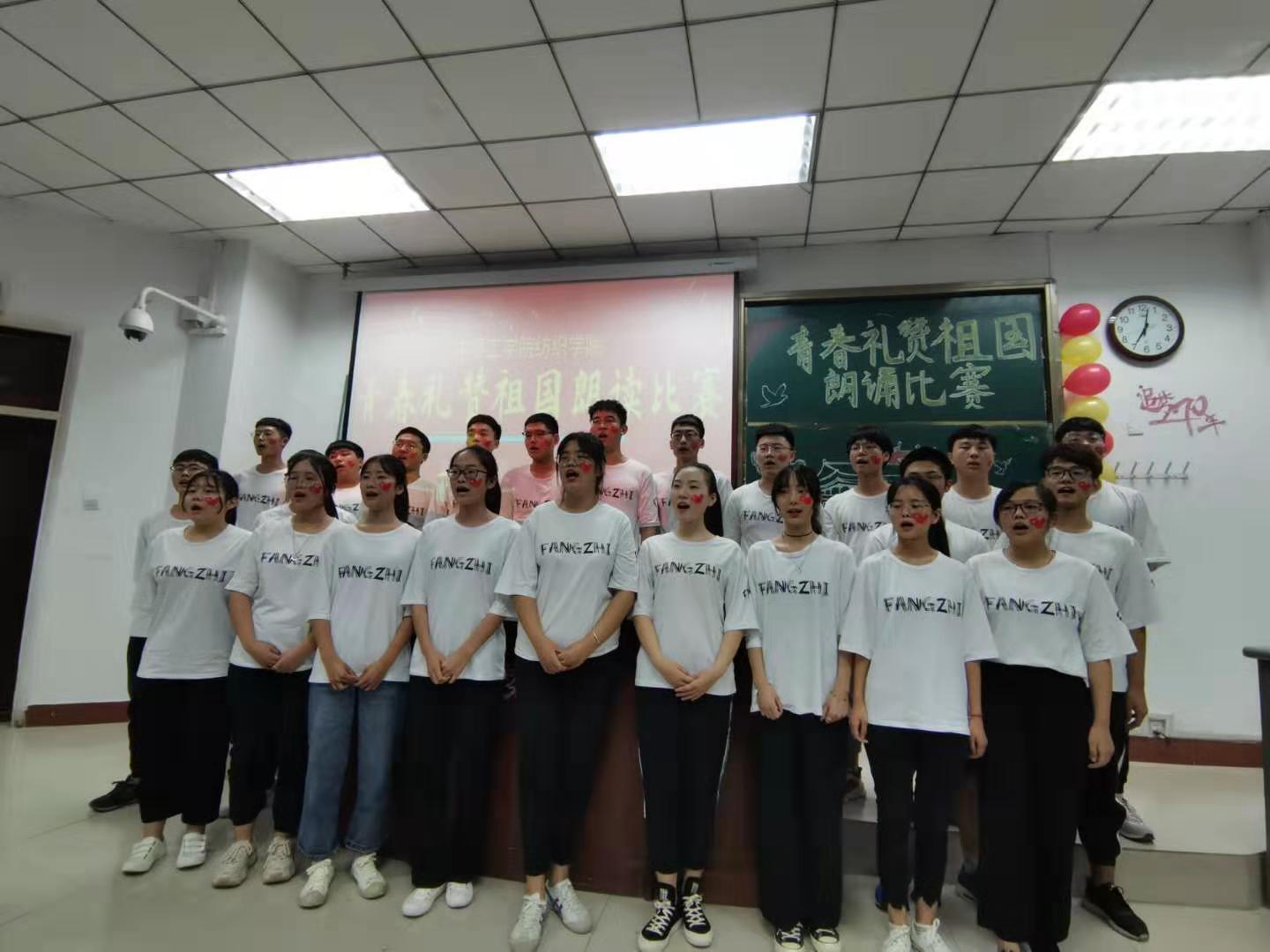 9月29日下午,williamhill中国纺织学院在4号楼101会议室举办“青春礼赞祖国”朗读比赛,庆祝中华人民共和国成立七十周年。纺织学院19级全体成员,18级纺织学院团总支学生会部分成员参与活动。
