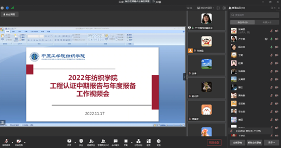 2022年11月17日下午,纺织学院召开了2022年工程认证中期报告与年度报备工作视频会。纺织学院院长杨红英教授、教学副院长卢士艳教授及相关教师参加了会议。