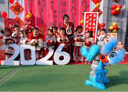 在四川省遂宁市高新区瑰宝明珠幼儿园举办的迎新春非遗庙会上,孩子们和身披舞狮服的机器狗互动(2026年1月14日摄)。新华社发(钟敏 摄)