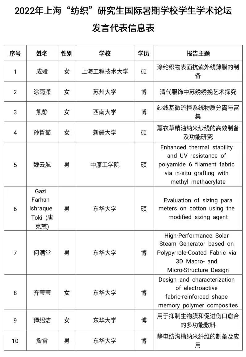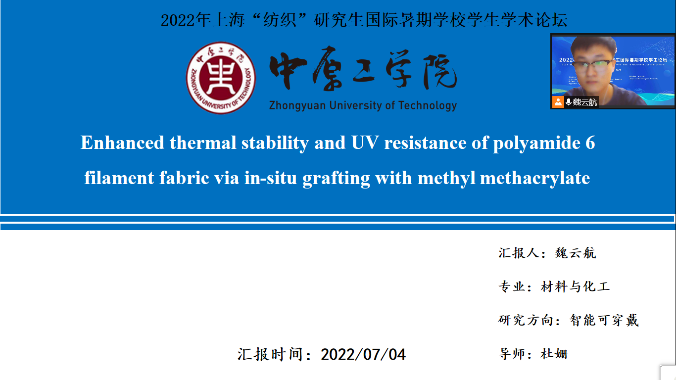 为响应贯彻落实大学生创新实践、加强大学生创新能力培养的政策,我院2020级研究生魏云航向东华大学组织的2022年上海“纺织”研究生国际暑期夏令营递交申请书并根据自己在校研究成果情况通过了申请,正式成为一名上海“纺织”研究生国际暑期夏令营学员。魏云航同学由于在校期间的研究成果突出,被邀请作为优秀学生代表参加2022年上海“纺织”研究生国际暑期学校学生论坛,同时受邀参加论坛的还有来自其他高校的9名硕士、博士研究生。在论坛上,大家齐聚一堂,畅所欲言,互相交流,在学术上有了很大的收获。7月8日,通过八天的学习与分享,魏云航同学收获颇丰,顺利结业。