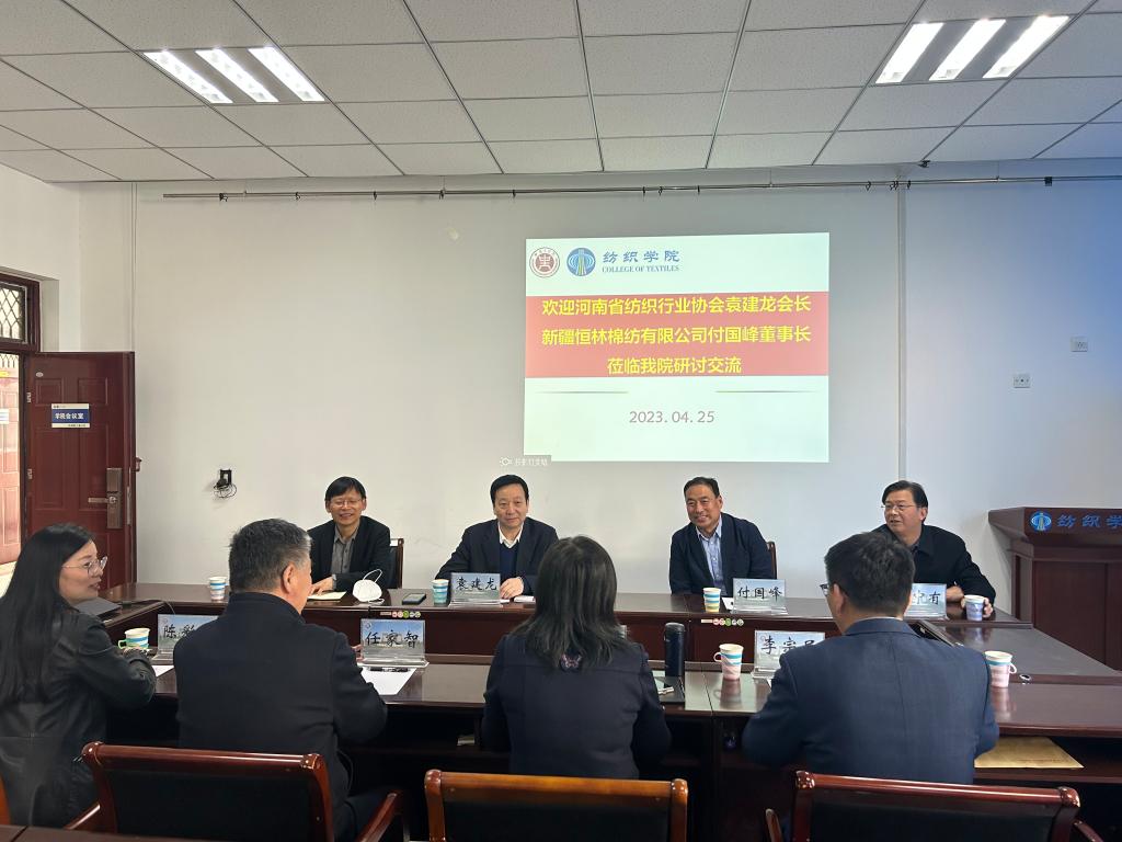 4月26日下午,河南省纺织行业协会会长袁建龙、协会秘书长李继锋、民盟省委秘书长姚中有、新疆恒林棉纺有限公司董事长付国峰、学校教育教学质量评估中心副主任李宗民一行莅临我院研讨交流。纺织学院院长杨红英、先进纺织装备技术河南省协同创新中心主任任家智、纺织学院副院长陈彩虹等参加了座谈会,会议由纺织学院院长杨红英主持。