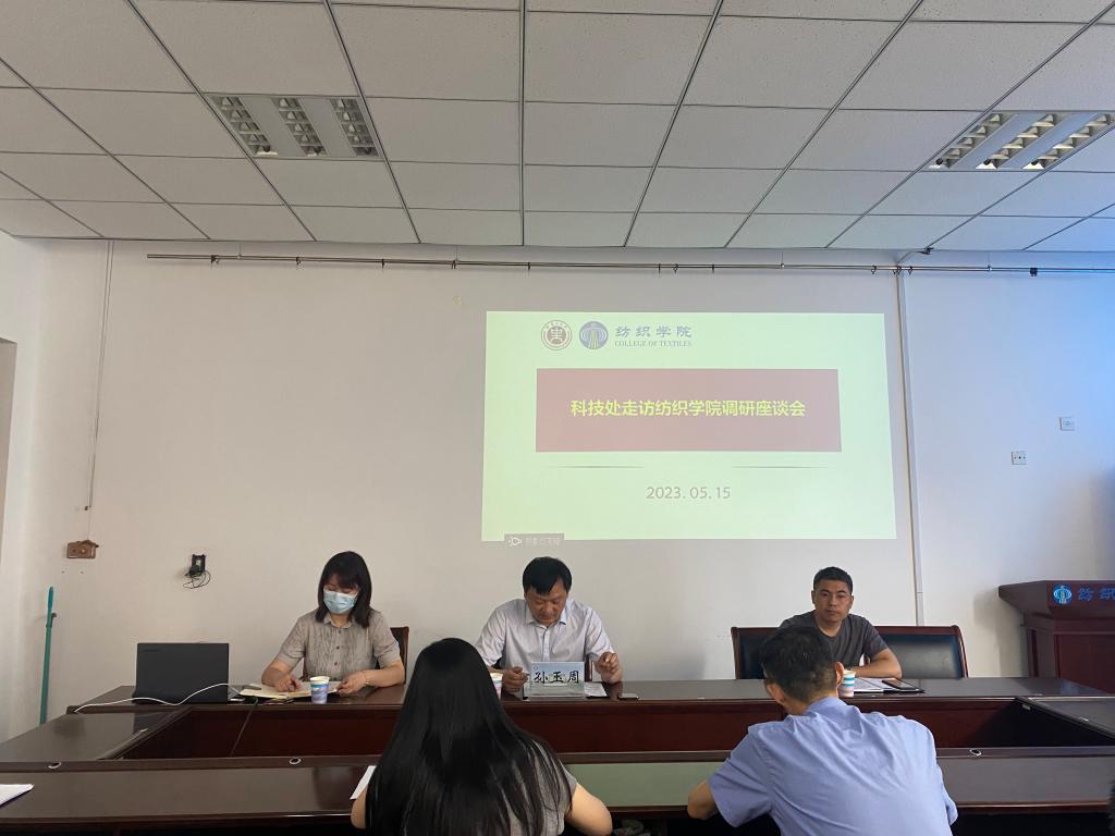 调研中,孙玉周处长以“如何提升产学研能力”为主题和科研特色为重点开展调研,纺织学院各位参会人员分别从项目成果申报、配套经费兑现、业绩量化以及跨学科交叉融合等方面发表自己的意见和看法。