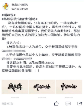 为教育引导同学们正确认识新型冠状病毒,做好病毒预防,疏导心理恐慌,凝聚青春正能量,坚决打赢疫情防控阻击战,纺织学院团总支学生会于2020年2月日—26日在线上举办“战疫情”网络主题教育活动。