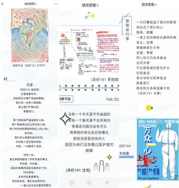 活动过程中,同学们精心准备,以诗歌的形式或利用电脑、手机等创作手绘、海报,生动有趣地普及了新型肺炎的传播途径、预防方法等相关知识,歌颂抗击新型肺炎过程中涌现出的先进典型人物和感人事迹,弘扬社会主义核心价值观与民族精神。“有人说这城市在休眠!而在我看来,它和其他城市一样!在蓄力,在抗争,在等待。愿冬去春来,登楼而望汉江澄澈已是新篇。” “全国人民勠力同心,誓与疫情抗争到底,我等候着,仿佛看到了夏日里武汉的樱花。”“正值青春年华,却因责任与尊严而选择奉献;我们的一生渺小而短暂,爱让我们不畏凶险,勇敢前行。” “约定好了,不要着急,我们马上就会见面。”虽然我们无法到一线作战,但同学们用文字表达了对武汉的美好祝福和对前线工作人员的赞美。