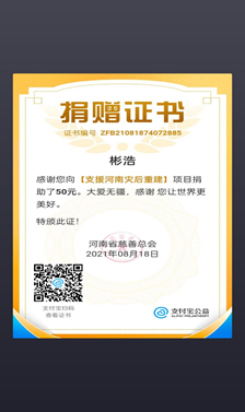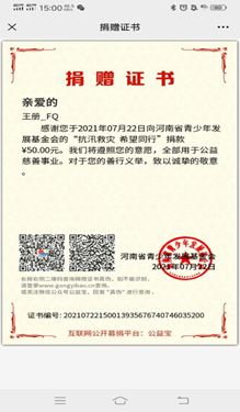 纺织学院学生第一党支部纺织193董靳磊参与了抗洪志愿者服务,帮助从洪水中转移出来的人员,发放救灾物资。纺织学院学生第一党支部纺织191班郭彬浩,纺织192班郝珊珊参与河南暴雨救灾捐助活动进行捐款,积极响应“一方有难,八方志愿”的号召。