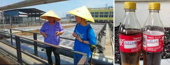 7月15日,同学们详细参观了企业的废水处理站,对废水来源、所含成分、处理技术与工艺路线、运行成本及存在的疑难问题进行了充分了解和交流,并细致地介绍了团队的科研项目情况,获得了企业技术员的肯定和建议。通过实地深入调研,同学们深刻地意识到印染废水处理问题的严重性、复杂性、迫切性及对生态环境保护的重要意义。最后,在征得管理人员的同意后,同学们获取了企业印染废水处理前和处理后的水样,计划待返校后进行相应的检测分析和实验。